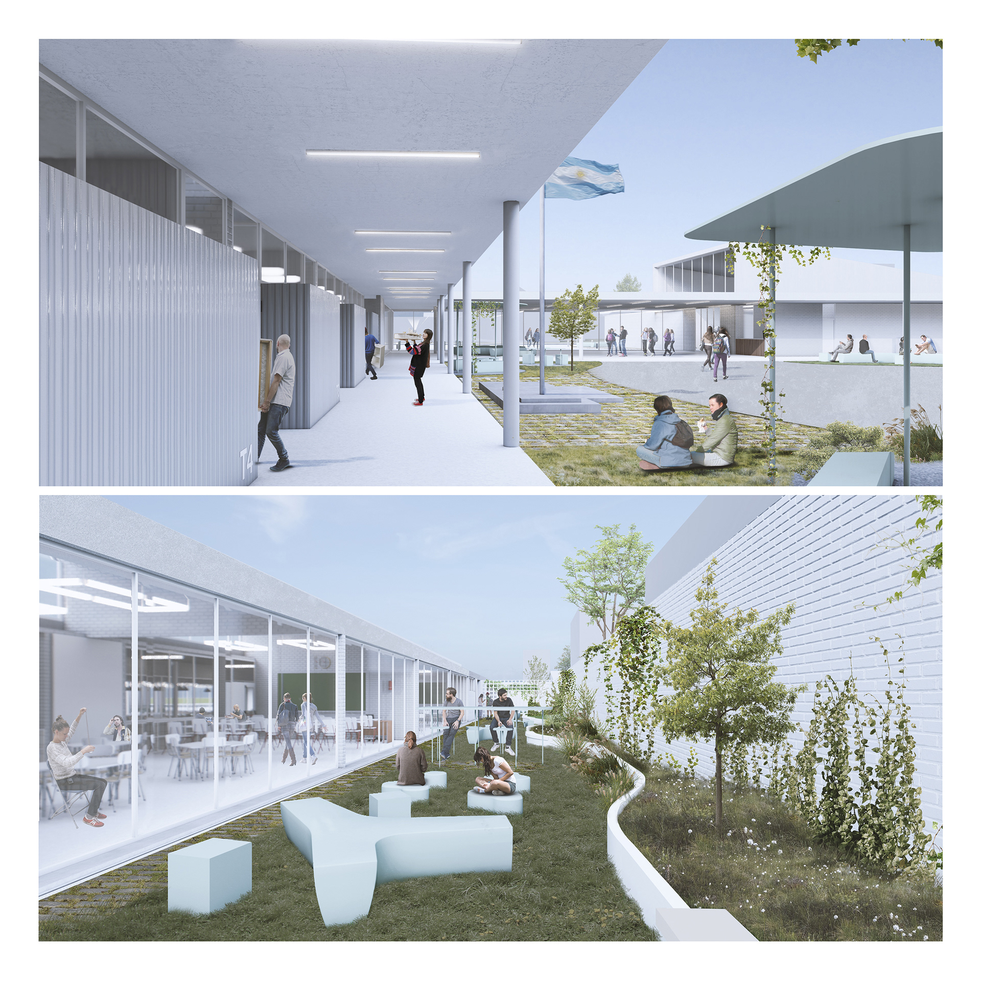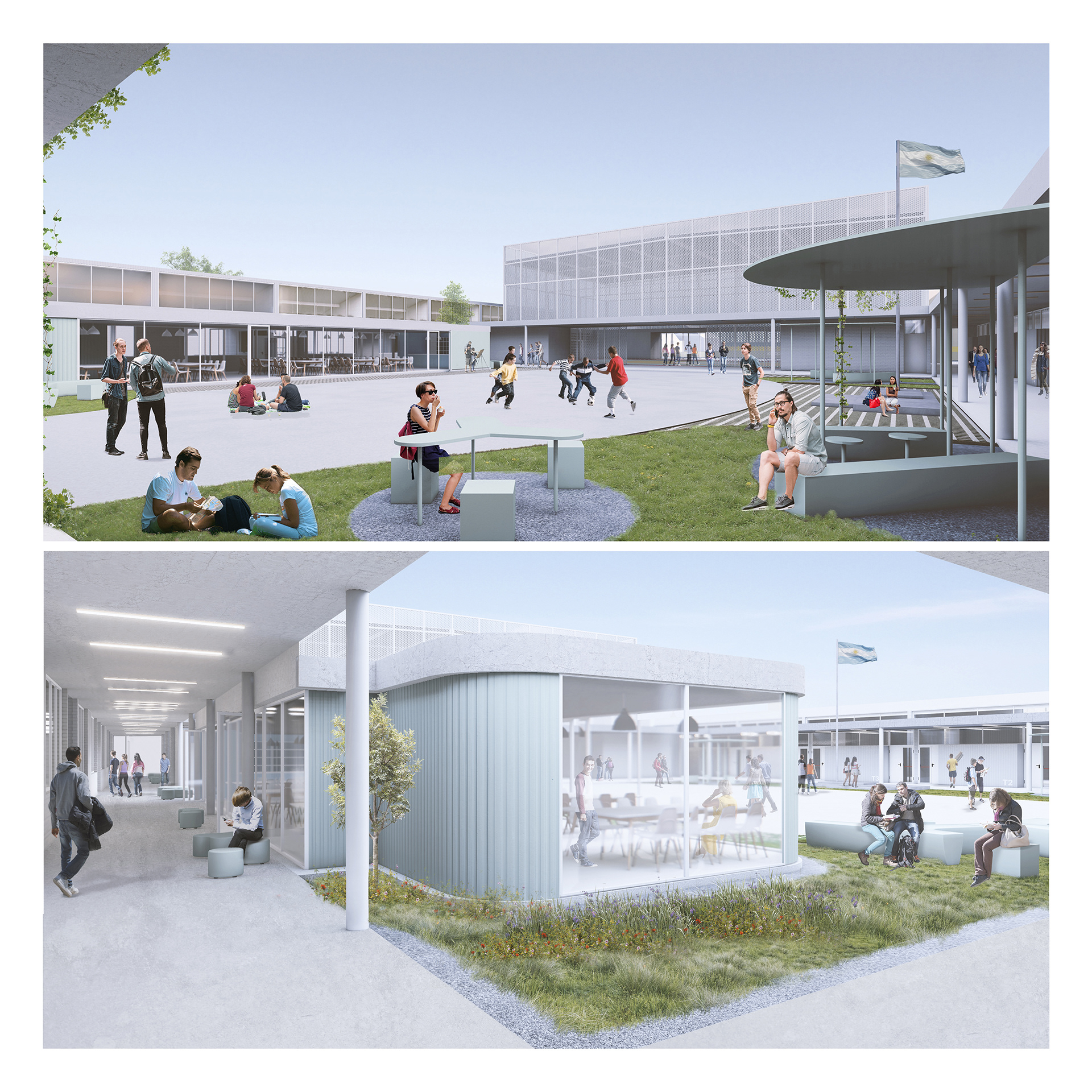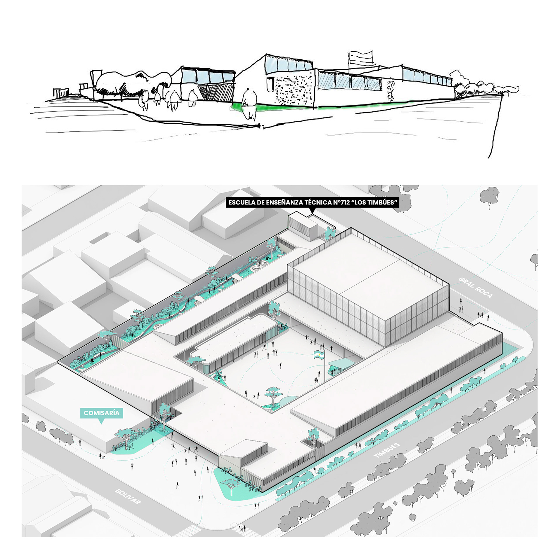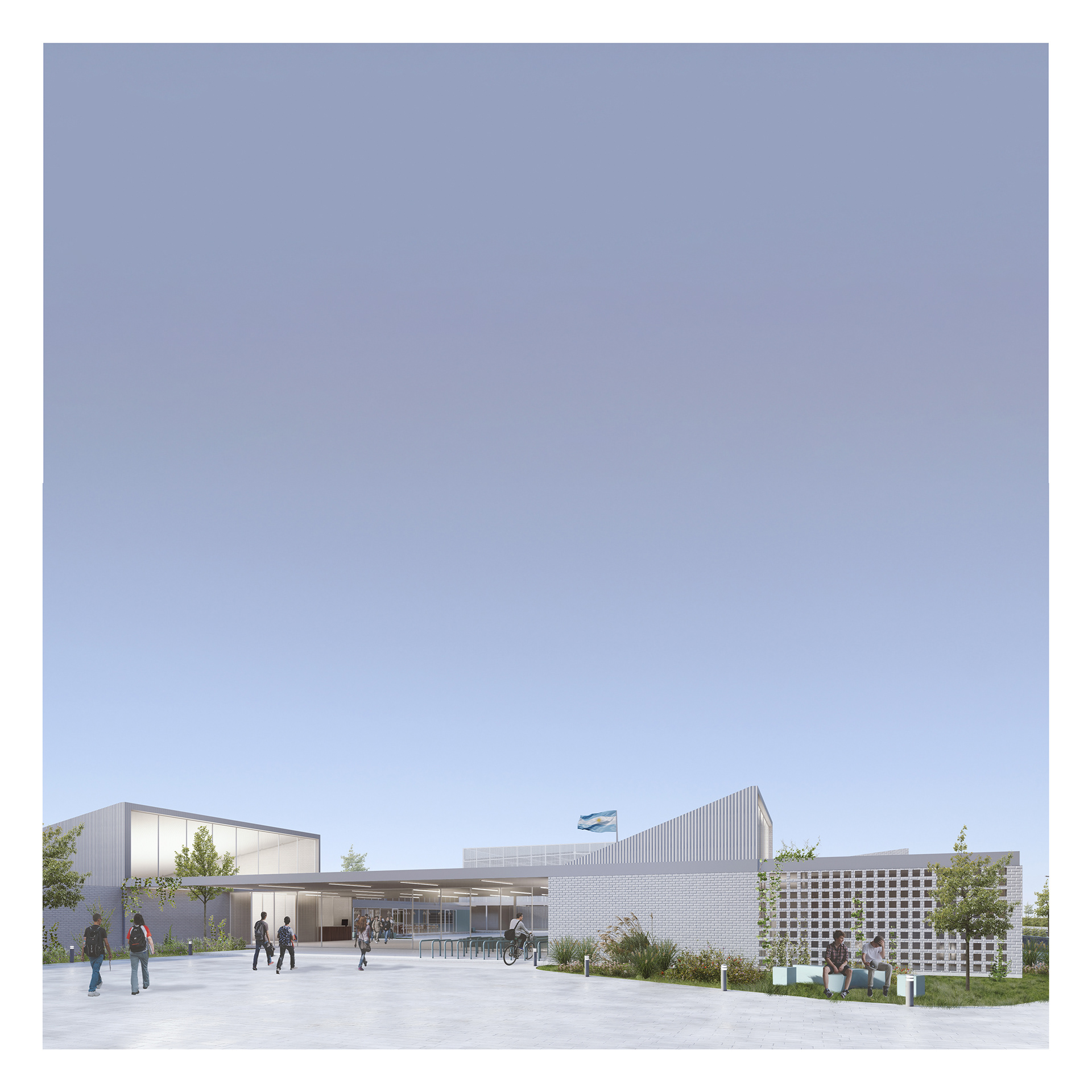 Primera Mención - Concurso Provincial de Anteproyectos Nuevo Edificio Escuela Técnica N°712 Timbues, Santa Fe. 2022. Equipo: Arq. Pablo Anzilutti, Arq. Ramiro Mairani, Arq. Fernández Roberto, Arq. Joaquin Verde, Arq. Valentin Monge.